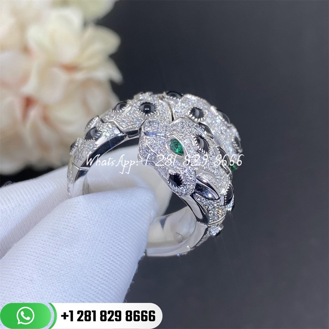 - Panthère de Cartier ring, yellow gold 750/1000, onyx, set with 2 emeralds and 242 brilliant-cut diamonds totalling 2.21 carats. Width of the pattern: 11.05 mm (for size 52).